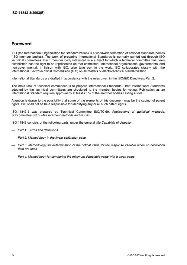 ISO 11843-3:2003 is a standard published by the International Organization for Standardization (ISO). Its full title is "Capability of detection - Part 3: Methodology for determination of the critical value for the response variable when no calibration data are used". This standard covers: ISO 11843-3:2003 gives a method of estimating the critical value of the response variable from the mean and standard deviation of repeated measurements of the reference state in certain situations in which the value of the net state variable is zero, for all reasonable and foreseeable purposes. Hence, it can be decided whether values of the response variable in an actual state (or test sample) are above the range of values attributable to the reference state. General procedures for determination of critical values of the response variable and the net state variable and of the minimum detectable value have been given in ISO 11843-2. Those procedures are applicable in situations in which there is relevant straight-line calibration and the residual standard deviation of the measured responses is either constant or is a linear function of the net state variable. The procedure given in this part of ISO 11843 for the determination of the critical value of the response variable only is recommended for situations in which no calibration data are used. The distribution of data is assumed to be normal or near-normal. The procedure given in this part of ISO 11843 is recommended for situations in which it is difficult to obtain a large amount of the actual states although a large amount of the basic state can be prepared.