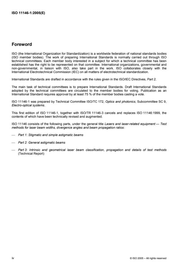 ISO 11146-1:2005 is a standard published by the International Organization for Standardization (ISO). Its full title is "Lasers and laser-related equipment — Test methods for laser beam widths, divergence angles and beam propagation ratios — Part 1: Stigmatic and simple astigmatic beams". This standard covers: ISO 11146-1:2005 specifies methods for measuring beam widths (diameter), divergence angles and beam propagation ratios of laser beams. ISO 11146-1:2005 is only applicable for stigmatic and simple astigmatic beams. If the type of the beam is unknown and for general astigmatic beams ISO 11146-2 is applicable.