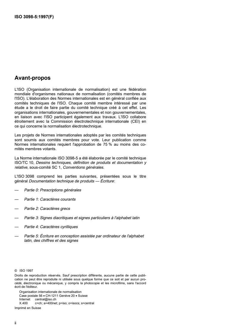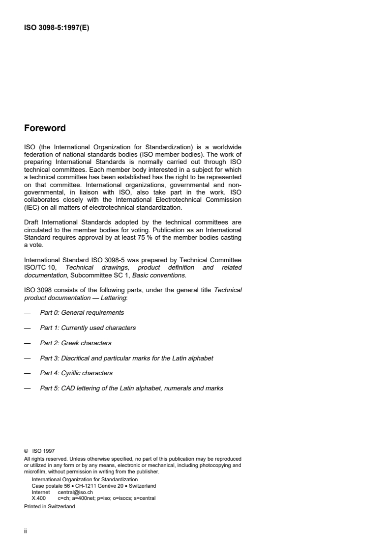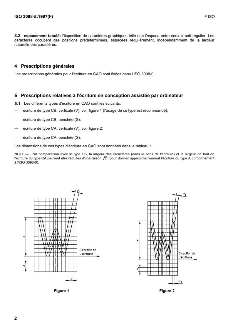 ISO 3098-5:1997 is a standard published by the International Organization for Standardization (ISO). Its full title is "Technical product documentation - Lettering - Part 5: CAD lettering of the Latin alphabet, numerals and marks". This standard covers: La présente partie de l'ISO 3098 fixe, en conformité avec toutes les autres parties de l'ISO 3098, les prescriptions générales de l'écriture en conception et dessin assistés par ordinateur (CDAO) devant être appliquées dans le domaine de la documentation technique de produits (en particulier aux dessins techniques). Elle comprend des principes conventionnels de base, ainsi que des règles relatives à l'écriture en CAO mettant en oeuvre les techniques des systèmes d'écriture et de dessin à commande numérique.