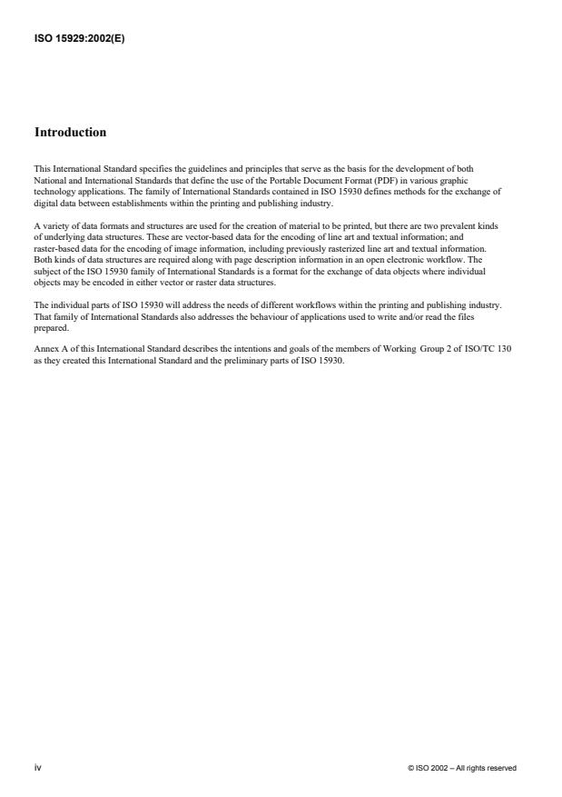 ISO 15929:2002 is a standard published by the International Organization for Standardization (ISO). Its full title is "Graphic technology — Prepress digital data exchange — Guidelines and principles for the development of PDF/X standards". This standard covers: This International Standard specifies the guidelines and principles that serve as the basis for the development of the parts of ISO 15930 that define the use of the Portable Document Format (PDF) in various graphic technology applications.