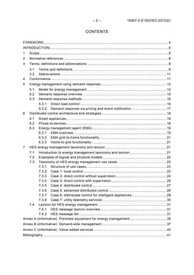 ISO/IEC 15067-3:2012 is a standard published by the International Organization for Standardization (ISO). Its full title is "Information technology - Home Electronic System (HES) application model - Part 3: Model of a demand-response energy management system for HES". This standard covers: ISO/IEC 15067-3:2012(E) specifies an energy management model for programs that manage the consumer demand for electricity using a method known as "demand response". Three types of demand response are specified in this standard: direct control, local control and distributed control. It replaces ISO/IEC TR 15067-3, first edition, published in 2000, and constitutes a technical revision. It includes the following significant technical changes with respect to the previous edition: - the demand response options have been expanded; - distributed energy resources such as local generation and storage have been included; - the terminology for demand response has been aligned with smart grid.
