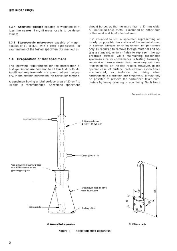- Apparatus and consumables: Allihn or Soxhlet condenser, 1 dm3 Erlenmeyer flask, glass cradle or specimen supports, boiling chips, silicone grease or PTFE sleeve for joints, heating device, analytical balance and stereoscopic microscope.