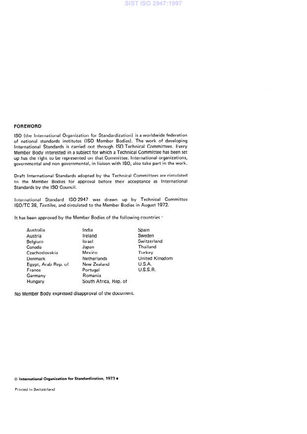 ISO 2947:1973 is classified under the following ICS (International Classification for Standards) categories: 59.080.01 - Textiles in general. The ICS classification helps identify the subject area and facilitates finding related standards.