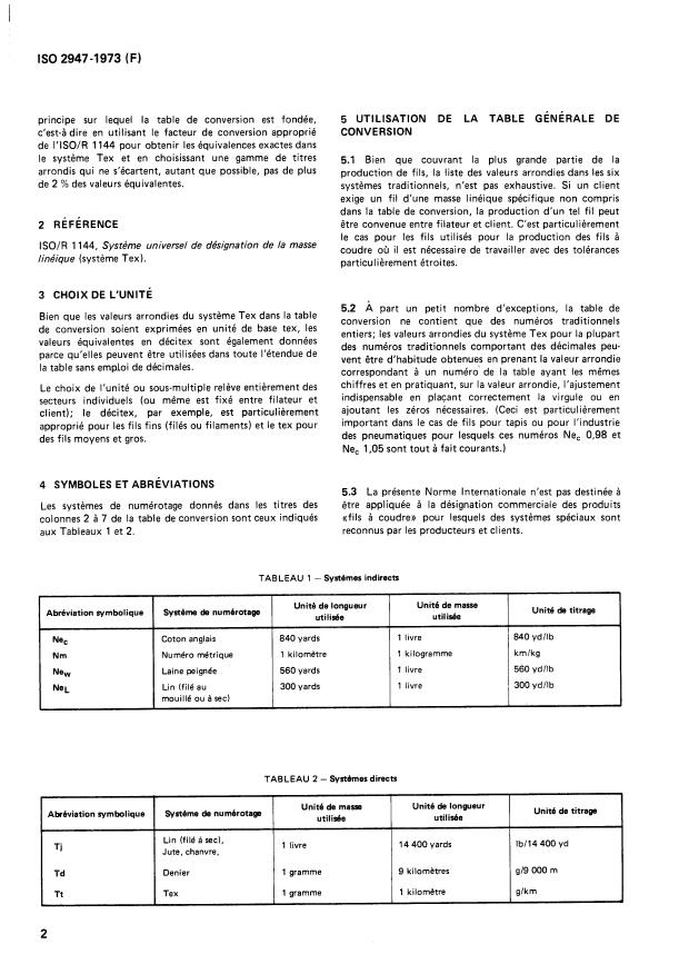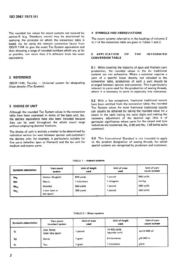 ISO 2947:1973 is a standard published by the International Organization for Standardization (ISO). Its full title is "Textiles - Integrated conversion table for replacing traditional yarn numbers by rounded values in the Tex System". This standard covers: This International Standard is intended to facilitate the changeover by industry and commerce from traditional yarn numbering systems to the Tex System. It provides a range of recommended rounded linear densities in the Tex System to replace the yarn numbers in the six main traditional numbering systems.