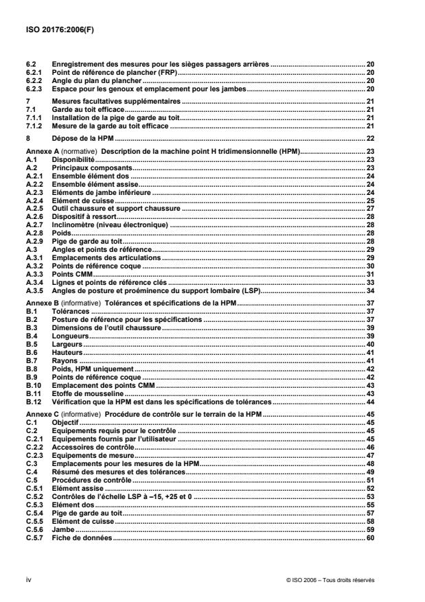 L'ISO 20176:2006 décrit les spécifications et les procédures relatives à l'utilisation de la machine point H (HPM) pour la vérification des positions des places assises dans le véhicule. La HPM est un outil physique utilisé pour déterminer des points de référence clés et effectuer des mesures dans un véhicule. L'outil de conception du point H (HPD) est une version CAD simplifiée de la HPM, qui peut être utilisée conjointement avec la HPM pour faire les mesures optionnelles spécifiées dans le document, ou qui est utilisée indépendamment lors de la conception d'un produit. Ces machines point H offrent une méthode permettant un positionnement et une mesure fiable des places assises et/ou des sièges des occupants. L'ISO 20176:2006 décrit les procédures d'utilisation de la machine point H (HPM) pour contrôler (vérifier) les mesures et les points de référence clés dans un véhicule. Les machines sont prévues pour être utilisées à des positions de siège déterminées. Ne pas les interpréter comme des outils qui mesurent ou indiquent les capacités ou le confort de I'occupant. Elles n'ont pas vocation à être utilisées pour définir ou évaluer les sièges temporaires tels que les strapontins.