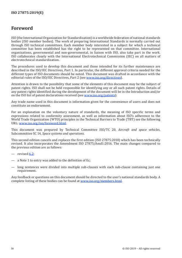 ISO 27875:2019 is a standard published by the International Organization for Standardization (ISO). Its full title is "Space systems — Re-entry risk management for unmanned spacecraft and launch vehicle orbital stages". This standard covers: This document provides a framework with which to assess, reduce, and control the potential risks that spacecraft and launch vehicle orbital stages (referred to hereinafter as "space vehicles") pose to people and the environment when those space vehicles re-enter the Earth's atmosphere and impact the Earth's surface. It is intended to be applied to the planning, design, and review of space vehicle missions for which controlled or uncontrolled re-entry is inevitable. This document is applicable to following objects in assessing their risk to the ground: a) objects re-entering from orbit in conformance with ISO 24113; b) launch vehicles (including payloads, other objects separated during the ascent phase, etc.) that are mentioned in flight safety activities under ISO 14620‑2[1]; and c) interplanetary spacecraft returning to Earth. This document complements ISO 14620‑1 and ISO 17666. This document is not applicable to spacecraft containing nuclear power sources[2]. NOTE 1 This document does not apply to Space Transportation Systems with wings and control functions intended for targeted landing. NOTE 2 Useful background information for this document is available in ISO 24113.