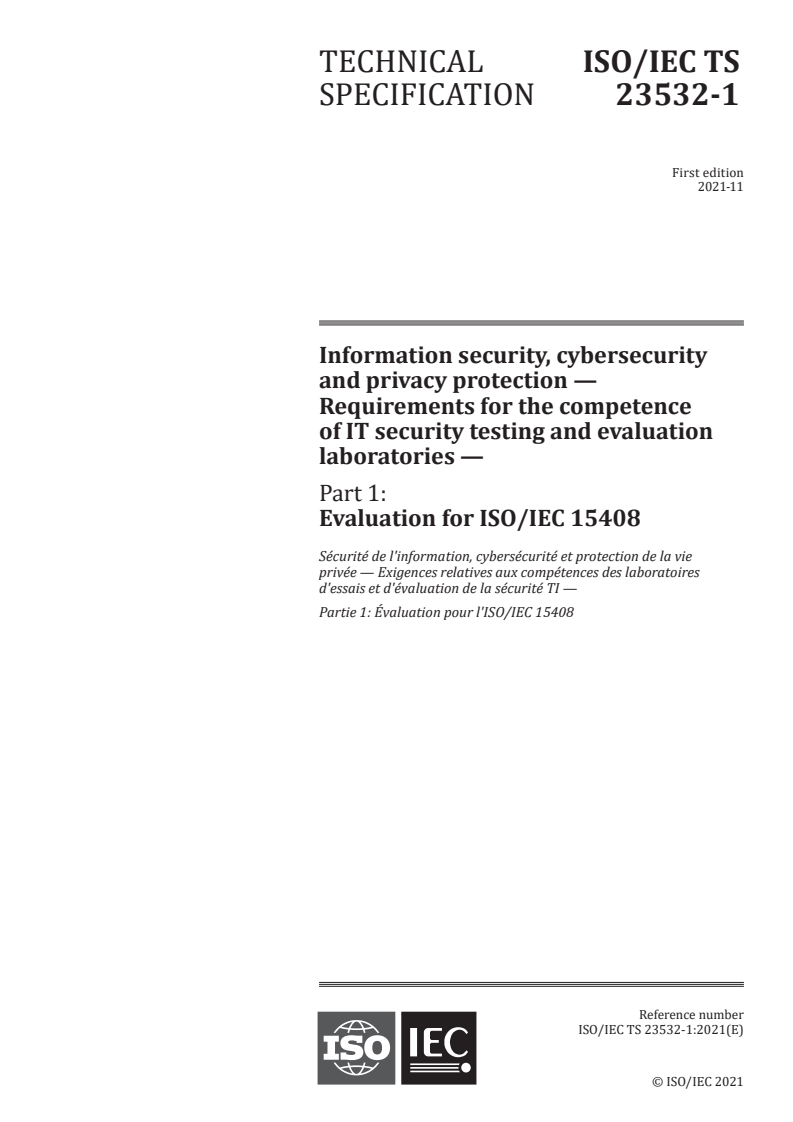 Keywords: ISO/IEC TS 23532-1:2021, information security, cybersecurity, IT security evaluation laboratory, ISO/IEC 15408, ISO/IEC 17025, Common Criteria, lab accreditation, evaluator competence.