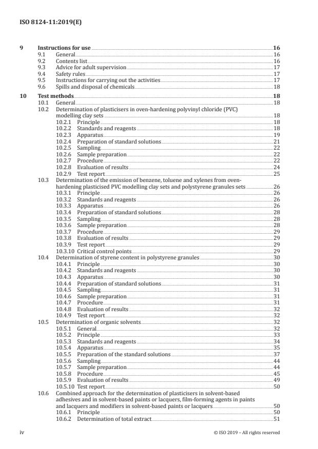 ISO 8124-11:2019 is a standard published by the International Organization for Standardization (ISO). Its full title is "Safety of toys — Part 11: Chemical toys (sets) other than experimental sets". This standard covers: This document specifies requirements and test methods for the substances and materials used in chemical toys (sets) other than experimental sets. These substances and mixtures are: — those classified as dangerous by the Globally Harmonized System of Classification and Labelling of Chemicals (GHS)[1]; — substances and mixtures which in excessive amounts could harm the health of the children using them and which are not classified as dangerous by the GHS; and — any other chemical substance(s) and mixture(s) delivered with the chemical toy. Additionally, requirements are specified for markings, warnings, safety rules, contents lists, instructions for use and first aid information. This document applies to: — plaster of Paris (gypsum) moulding sets; — oven-hardening plasticised PVC modelling clay sets; — polystyrene granules sets; — embedding sets; — adhesives, paints, lacquers, varnishes, thinners and cleaning agents (solvents) supplied or recommended in model sets.