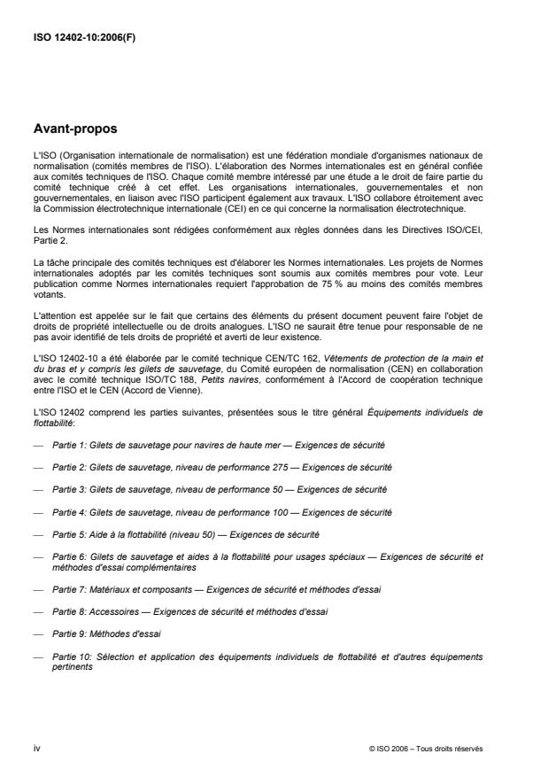 ISO 12402-10:2006 is a standard published by the International Organization for Standardization (ISO). Its full title is "Personal flotation devices — Part 10: Selection and application of personal flotation devices and other relevant devices". This standard covers: ISO 12402-10:2006 gives guidance for the selection and application of personal flotation devices complying with the other relevant parts of ISO 12402 and immersion suits according to ISO 15027-1 to ISO 15027-3.