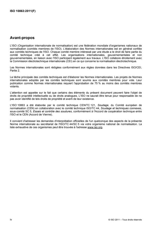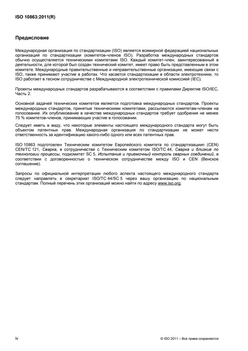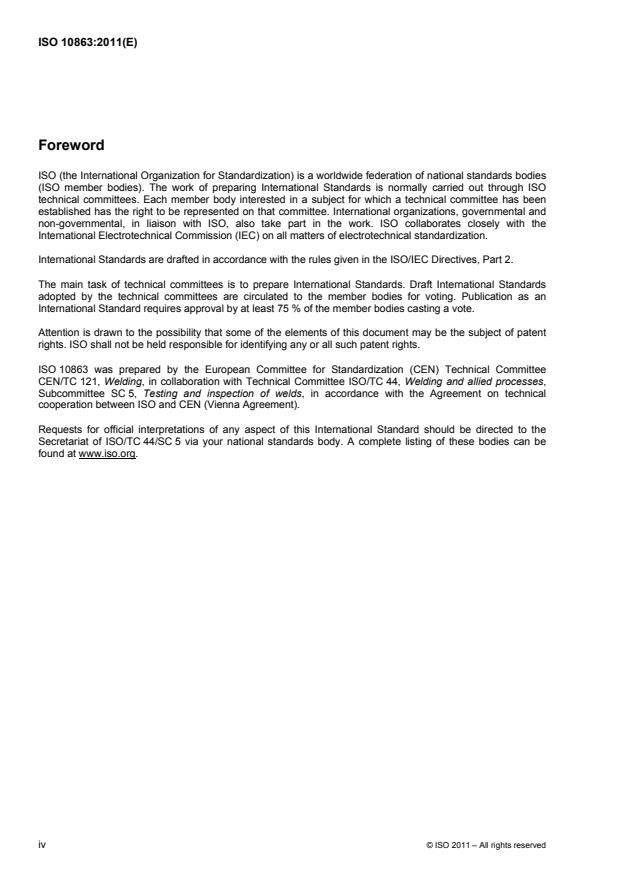 ISO 10863:2011 is a standard published by the International Organization for Standardization (ISO). Its full title is "Non-destructive testing of welds — Ultrasonic testing — Use of time-of-flight diffraction technique (TOFD)". This standard covers: ISO 10863:2011 specifies the application of the time-of-flight diffraction (TOFD) technique to the semi- or fully automated ultrasonic testing of fusion-welded joints in metallic materials of minimum thickness 6 mm. It applies to full penetration welded joints of simple geometry in plates, pipes, and vessels, where both the weld and parent material are low-alloyed carbon steel. Where specified and appropriate, TOFD can also be used on other types of materials that exhibit low ultrasonic attenuation (especially that due to scatter). Where material-dependent ultrasonic parameters are specified in ISO 10863:2011, they are based on steels having a sound velocity of (5 920 ± 50) m/s for longitudinal waves, and (3 255 ± 30) m/s for transverse waves. It is necessary to take this fact into account when examining materials with a different velocity. ISO 10863:2011 makes reference to the basic standard EN 583‑6 and provides guidance on the specific capabilities and limitations of TOFD for the detection, location, sizing and characterization of discontinuities in fusion-welded joints. TOFD can be used as a stand-alone method or in combination with other NDT methods or techniques, for manufacturing inspection, and for in-service inspection. ISO 10863:2011 specifies four testing levels (A, B, C, D) in accordance with ISO 17635 and corresponding to an increasing level of inspection reliability. Guidance on the selection of testing levels is provided. ISO 10863:2011 permits assessment of TOFD indications for acceptance purposes. This assessment is based on the evaluation of transmitted, reflected and diffracted ultrasonic signals within a generated TOFD image. ISO 10863:2011 does not include acceptance levels for discontinuities.