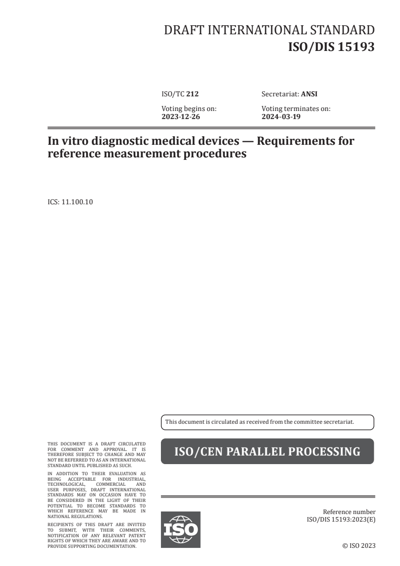 ISO/FDIS 15193 - In vitro diagnostic medical devices — Requirements for reference measurement procedures/31/2023