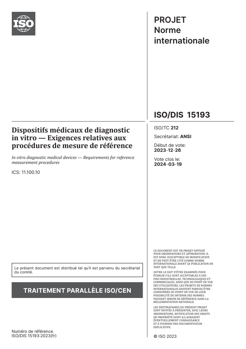 ISO/FDIS 15193 - Dispositifs médicaux de diagnostic in vitro — Exigences relatives aux procédures de mesure de référence/5/2024