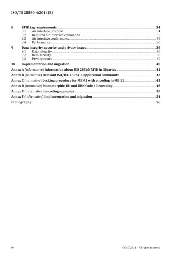 ISO/TS 28560-4:2014 defines rules for ISO 28560‑1 data elements to be encoded in radio frequency identification (RFID) tags with a memory structure that is partitioned into four memory banks. This primarily applies to ISO/IEC 18000‑63 (previously known as ISO/IEC 18000‑6 Type C) operating in the UHF frequency, but not necessarily restricted to this technology. The rules for encoding a subset of data elements taken from the total set of data elements defined in ISO 28560‑1 are based on ISO/IEC 15962, which uses an object identifier structure to identify data elements. This part of ISO 28560 defines the rules for encoding a unique item identifier in a specific memory bank, known as MB 01, taking into account different requirements for privacy. It also defines the rules for encoding other relevant data in a separate memory bank, known as MB 11. Each of these memory banks is addressable using different command set of the appropriate RFID technology. As with other parts of ISO 28560, this part of ISO 28560 is appropriate for the needs of all types of libraries (including academic, public, corporate, special, and school libraries). ISO/TS 28560-4:2014 provides essential standards-based information about RFID in libraries. A source of additional information about implementation issues is provided in Annex A.