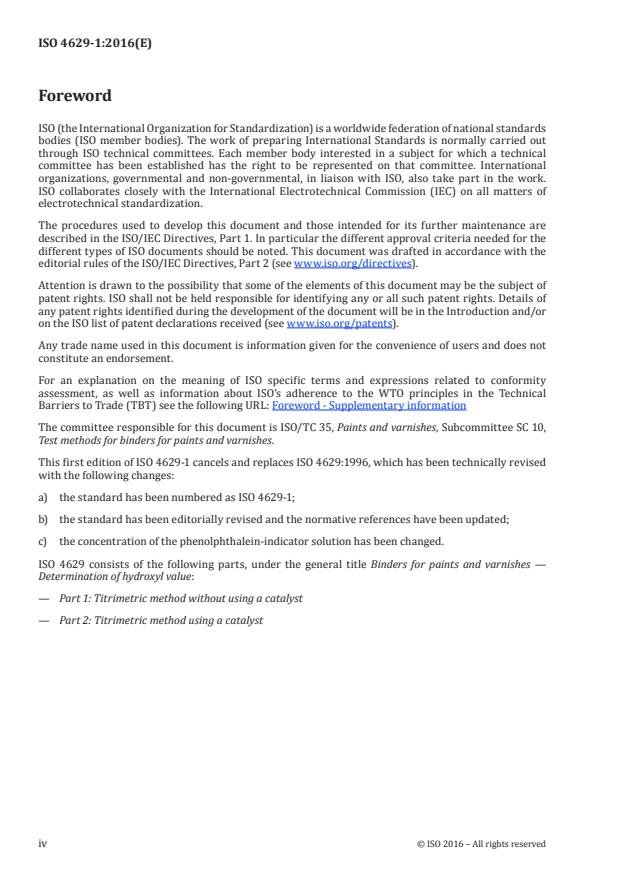 ISO 4629-1:2016 is a standard published by the International Organization for Standardization (ISO). Its full title is "Binders for paints and varnishes — Determination of hydroxyl value — Part 1: Titrimetric method without using a catalyst". This standard covers: ISO 4629-1:2016 specifies a titrimetric method for determining the free hydroxyl groups in binders and binder solutions for paints and varnishes. The hydroxyl groups may be present as polyhydric alcohols, partial esters, polyester end groups or hydroxylated fatty acids. This method is not applicable to resins containing both hydroxyl groups and epoxy groups, because the latter will also be included in the result. Also the method is not applicable to cellulose nitrate or to phenolic resins. NOTE 1 If, in the case of binder solutions, the hydroxyl value of the binder only is to be determined, the possibility that other constituents of the binder solution may contain hydroxyl groups has to be taken into account. NOTE 2 A method for the determination of the hydroxyl value of epoxy resins is specified in ISO 7142[1].