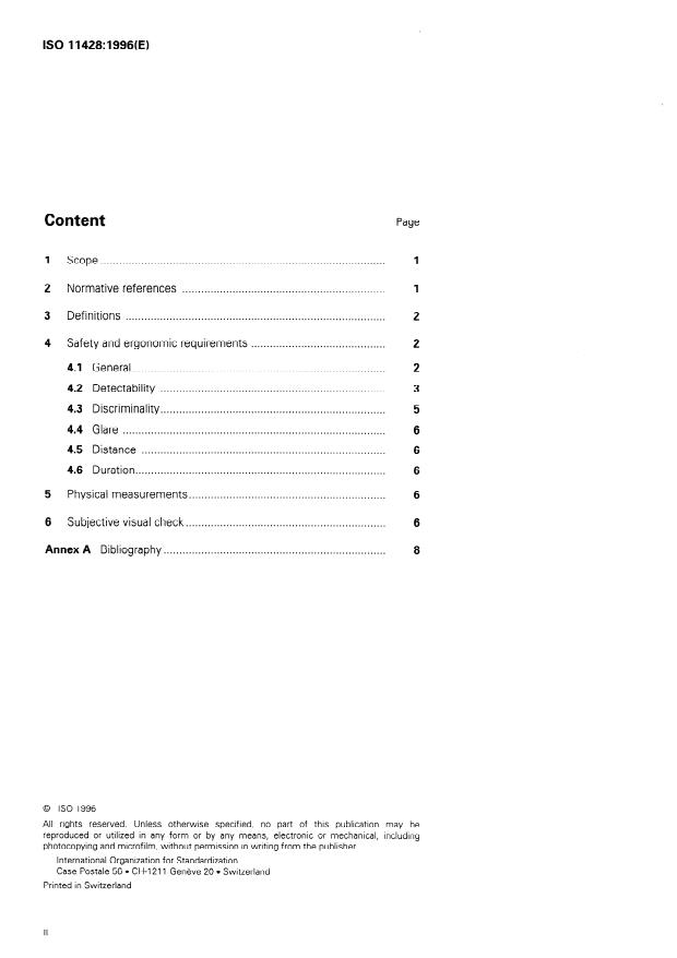 Keywords: ISO 11428, ergonomics, visual danger signals, luminance, illuminance, contrast, detectability, discriminability, flashing alarm, emergency signal, safety requirements, signal reception area.