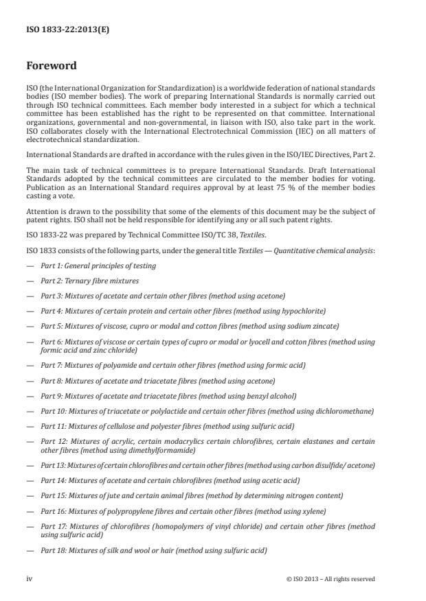 ISO 1833-22:2013 is a standard published by the International Organization for Standardization (ISO). Its full title is "Textiles — Quantitative chemical analysis — Part 22: Mixtures of viscose or certain types of cupro or modal or lyocell and flax fibres (method using formic acid and zinc chloride)". This standard covers: ISO 1833-22:2013 is applicable, after removal of non-fibrous matter, to binary mixtures of viscose or certain types of the current cupro or modal or lyocell fibres with flax fibres. If a cupro or modal fibre is found to be present, a preliminary test should be carried out to see whether it is soluble in the reagent. ISO 1833-22:2013 is not applicable to mixtures in which the flax fibre has suffered extensive chemical degradation, nor when the viscose, cupro, modal or lyocell fibre is rendered incompletely soluble by the presence of certain permanent finishes or reactive dyes that cannot be removed completely.