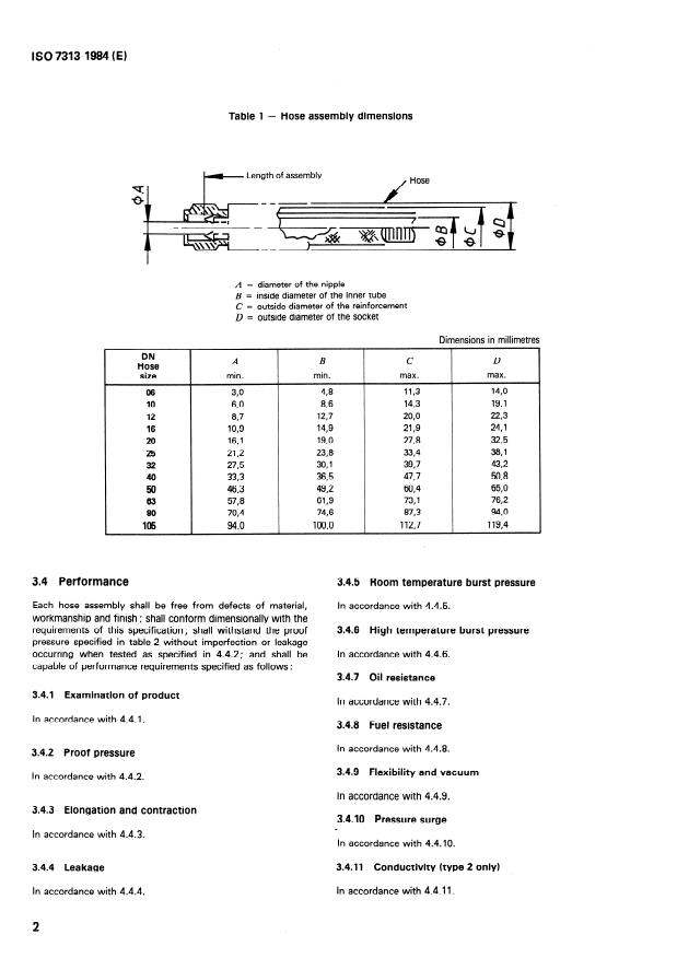 ISO 7313:1984 is a standard published by the International Organization for Standardization (ISO). Its full title is "Aircraft — High temperature convoluted hose assemblies in polytetrafluoroethylene (PTFE)". This standard covers: Gives characteristics of these assemblies for use in aircraft fluid systems at temperatures between -55 and +200 °C and at nominal pressures, depending on bore size, up to 6,8 MPa. Special approval from the proper national authority may be required it these hoses are to be part of a pressurized gas storage system. Two types of hose assembly are covered: Typ 1 - non-conductive inner tube and type 2 - conductive inner tube.