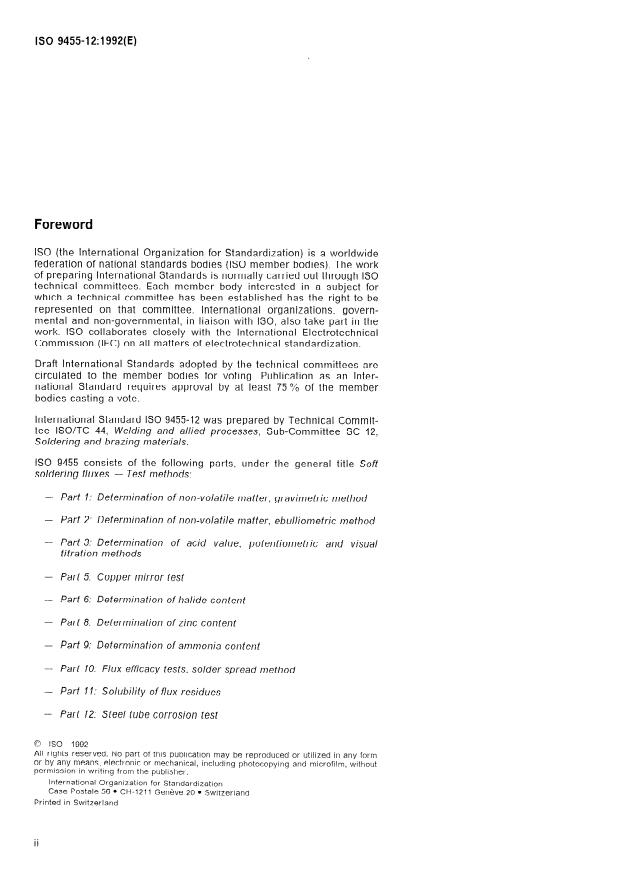 ISO 9455-12:1992 is a standard published by the International Organization for Standardization (ISO). Its full title is "Soft soldering fluxes — Test methods — Part 12: Steel tube corrosion test". This standard covers: Specifies a qualitative method for assessing the corrosive properties of flux residues and flux vapours towards mild steel. The test is applicable to all fluxes, although it is primarily intended to be used for fluxes of type 1 according to ISO 9454-1.