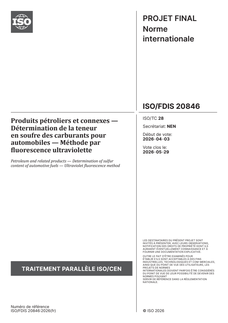 ISO/FDIS 20846:2026 establishes a standardized ultraviolet (UV) fluorescence test method for determining the sulfur content in a wide range of automotive fuels and related petroleum products. Developed by the International Organization for Standardization (ISO), this standard supports global efforts to monitor and control sulfur content as part of environmental and product quality initiatives. The method applies to: