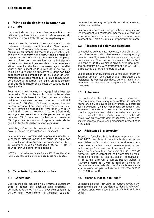 ISO 10546:1993 is a standard published by the International Organization for Standardization (ISO). Its full title is "Chemical conversion coatings — Rinsed and non-rinsed chromate conversion coatings on aluminium and aluminium alloys". This standard covers: Specifies requirements relating to the coatings intended to give protection against corrosion and as a base for other coatings. Requirements are concerned with surface preparation, method of application, electrical insulation resistance, adhesion, corrosion resistance, coating mass per unit area, coating mass significance, coating identification, sampling and test specimens, classification. Annex A describes qualitative testing of the layer composition, annex B gives treatment sequence options.