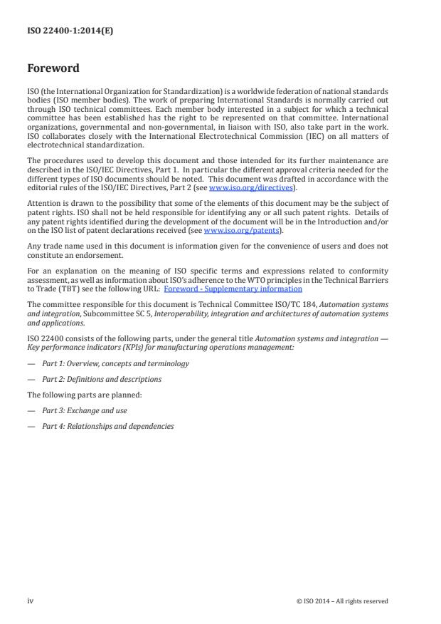 ISO 22400-1:2014 is a standard published by the International Organization for Standardization (ISO). Its full title is "Automation systems and integration - Key performance indicators (KPIs) for manufacturing operations management - Part 1: Overview, concepts and terminology". This standard covers: ISO 22400 specifies an industry-neutral framework for defining, composing, exchanging, and using key performance indicators (KPIs) for manufacturing operations management (MOM), as defined in IEC 62264‑1 for batch, continuous and discrete industries. ISO 22400-1:2014: provides an overview of what a KPI is, presents concepts of relevance for working with KPIs including criteria for constructing KPIs, specifies terminology related to KPIs, and describes how a KPI can be used.