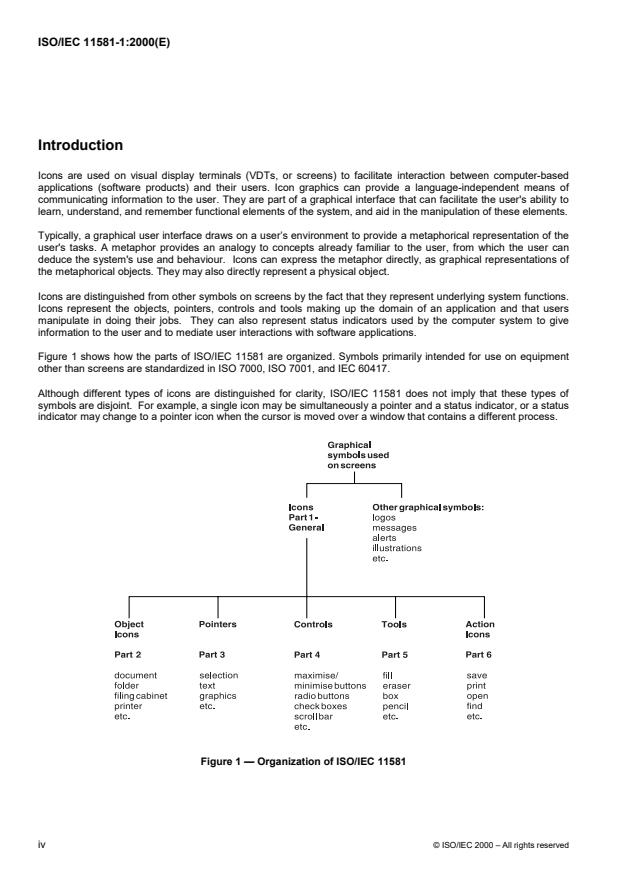 ISO/IEC 11581 applies to software products providing office applications such as document production, desktop publishing, finance, and planning that present their functions via a graphical user interface. ISO/IEC 11581 applies to software products for people who are familiar with office work but who are at present not necessarily familiar with computer-based applications. ISO/IEC 11581 is meant to be used by persons involved in the design, implementation, and evaluation of icons for graphical user interfaces to computer-based office applications, and by procurers of systems that employ such interfaces. Other parts of ISO/IEC 11581 contain: _ graphics of commonly used icons, and _ descriptions of the functionality of the icons. This part of ISO/IEC 11581-1 provides a framework for the development and design of icons and their application on screens capable of displaying graphics as well as text. It contains: _ general requirements and recommendations for icons; _ global variations to the graphical representations of icons.