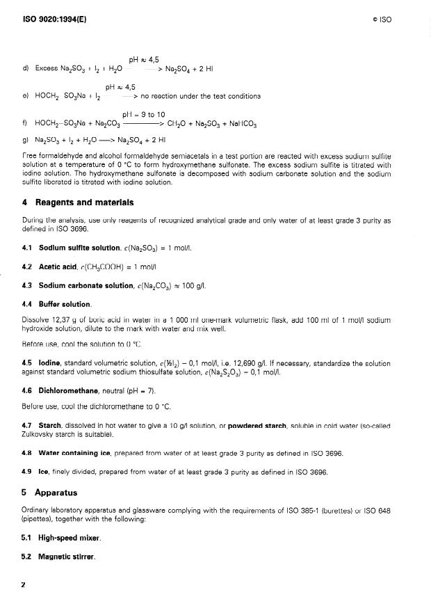 ISO 9020:1994 is a standard published by the International Organization for Standardization (ISO). Its full title is "Binders for paints and varnishes — Determination of free-formaldehyde content of amino resins — Sodium sulfite titrimetric method". This standard covers: The method specified is based on reacting free formaldehyde and alcohol formaldehyde semiacetals in a test portion with excess sodium sulfite solution at a temperature of 0 °C to form hydroxymethane sulfonate, titrating the excess sodium sulfite with iodine solution, decomposing hydroxymethane sulfonate with sodium carbonate solution and titrating the sodium sulfite liberated with iodine solution. The method is applicable to resins resulting from the polycondensation of urea and melamine with formaldehyde and to furan resins resulting from the polycondensation of furfuryl alcohol with formaldehyde without further modification.