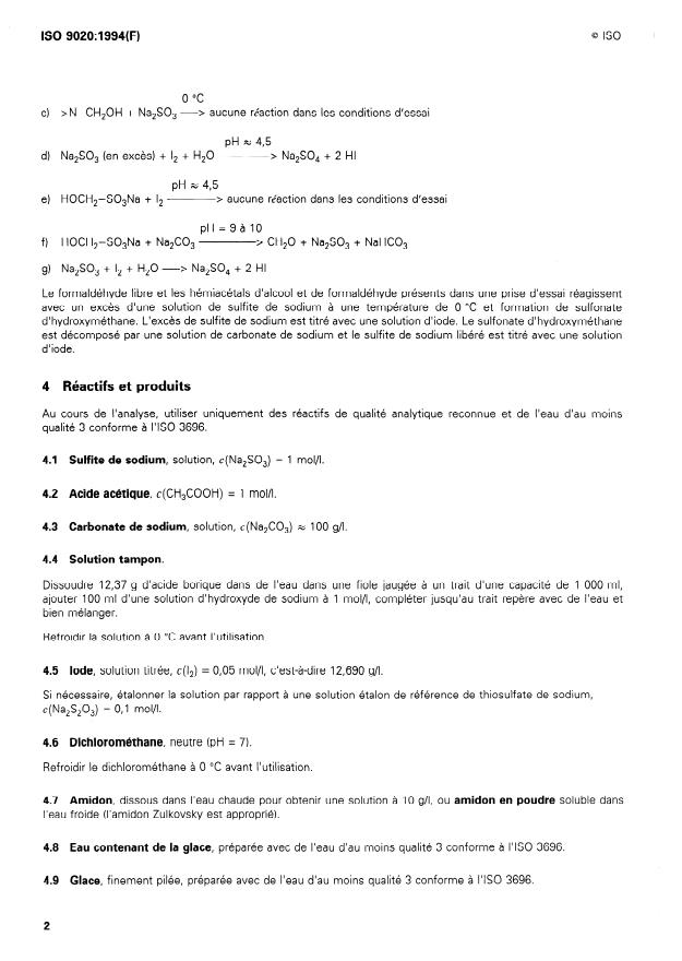 d’hydroxyméthane. L’excès de sulfite de sodium est titré avec une solution d’iode. Le sulfonate d’hydroxyméthane
