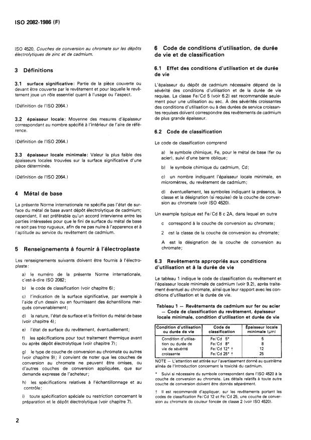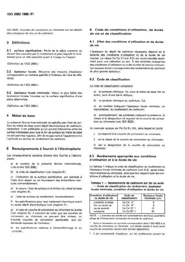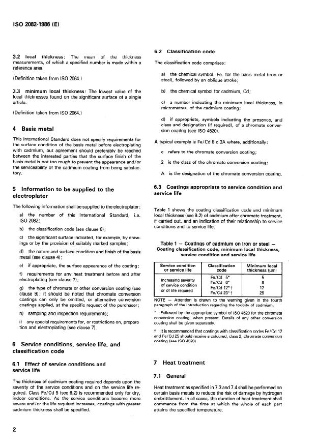 INTERNATIONALSTANDARD ISO 20824986 (E) Metallic coatings - Electroplated coatings of Cadmium on iron or steel 0 Introduction This International Standard specifies a range of electroplated coatings of Cadmium for the protection of iron and steel against corrosion under various Service conditions. The surface condition of the basis metal is not specified in this International Standard. CAUTION - Cadmium vapour is toxic by inhalation. Dur- ing heat treatment, therefore, all precautions must be taken to ensure that no person is exposed to it. Because of its toxicity, Cadmium should not be employed as a coating for any Object likely to come into contact with food or beverages. Attention is also drawn to the danger arising from welding, soldering or heating of Cadmium as its vapour is toxic. Attention is drawn to the fact that electroplated Cadmium is more readily soldered than electroplated zinc. Chromate conversion coatings give additional protection against corrosion and may only be omitted at the specific re- quest of the purchaser. The types of chromate coating which tan be produced on electroplated Cadmium coatings are described more fully in ISO 4520. Cadmium-electroplated articles to be painted may require alternative treatment such as phosphating to provide good adhesion. Cadmium-plated articles are subject to attack by certain organic materials, for example cardboard, wood or certain electrical in- sulating materials which emit reactive vapours. Cognizance should be taken of this fact when articles are packed, stored or transported. lt is essential that the purchaser states the classification Code. Merely to ask for Cadmium electroplating to be carried out in accordance with ISO 2082 without this information is insufficient. b) to close-coiled springs; c) for other than protective or decorative purposes. lt includes information to be supplied by the purchaser to the electroplater and requirements for heat treatment, both before and after electroplating . The coating thickness that tan be applied to threaded com- ponents may be limited by dimensional requirements, including class or fit. Attention is drawn to ISO 4042, which specifies the maximum thicknesses that tan be applied to Standard threads. 2 References ISO 1463, Metallic and Oxide coatings - Measurement of cos ting thickness - Microscopical method. ISO 2064, Metallic and other non-organic coatings - Defini- tions and conventions concerning the measurement of thickness. ISO 2177, Metallic coatings - Measurement of coating thickness - Coulome tric method b y anodic dissolu tion. ISO 2178, Non-magnetic coatings on magnetic Substrates - Measuremen t of coating thickness - Magnetit method. ISO 4042, Threaded components - Electroplated coatings .1) ISO 4518, Metallic coatings - Measurement of coating thickness - Pro filome tric me thod. ISO 4519, Electrodeposited metallic coatings and related finishes - Sampling procedures for inspection by attributes. ISO 4520, Chromate conversion coatings on electropfated zinc and Cadmium coatings. 3 Definitions 1 Scope and field of application This International Standard specifies requirements for electro- plated coatings of Cadmium on iron or steel except for coatings applied : a) to sheet, Strip or wire in the unfabricated form; 3.1 significant surface : The part of the article covered or to be covered by the coating and for which the coating is essential for serviceability and/or appearance. (Definition taken from ISO 2064.) 1) At present at the Stage of draft. 1 SIST ISO 2082:1999
