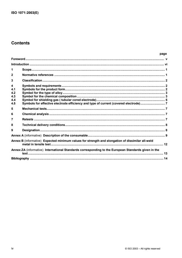 ISO 1071:2003 specifies requirements for classification of covered electrodes for manual metal arc welding, wire electrodes for metal arc welding, tubular cored electrodes for metal arc welding with and without a gas shield, rods for TIG-welding and rods for oxyfuel gas welding of unalloyed cast irons. Classification is based on the chemical composition of wires and rods and on the all-weld metal deposit for tubular cored and covered electrodes.