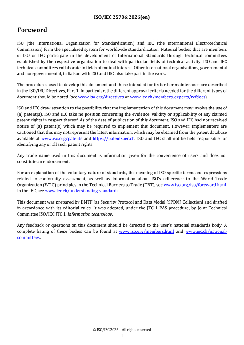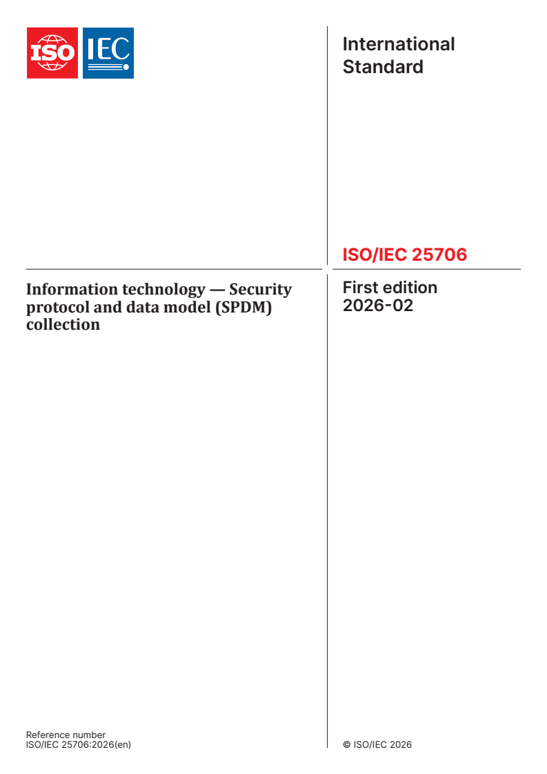 ISO/IEC 25706:2026 is a standard published by the International Organization for Standardization (ISO). Its full title is "Information technology — Security protocol and data model (SPDM) collection". This standard covers: Information technology — Security protocol and data model (SPDM) collection