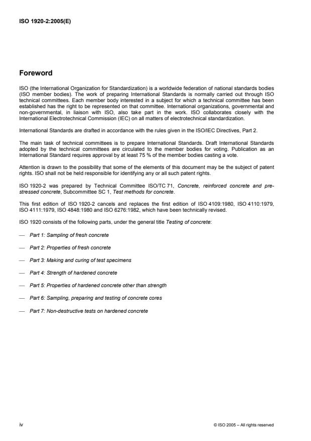 ISO 1920-2:2005 specifies procedures for testing fresh concrete. It specifies the following test methods: determination of consistence (slump test, Vebe test, degree of compactability, flow table test and for high fluidity concrete, the slump-flow test), determination of fresh density and determination of air content by the pressure gauge method and by the water column method.