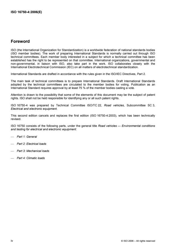 ISO 16750-4:2006 is a standard published by the International Organization for Standardization (ISO). Its full title is "Road vehicles — Environmental conditions and testing for electrical and electronic equipment — Part 4: Climatic loads". This standard covers: ISO 16750 applies to electric and electronic systems/components for road vehicles. It describes the potential environmental stresses and specifies tests and requirements recommended for the specific mounting location on/in the vehicle. ISO 16750-4:2006 describes the climatic loads.
