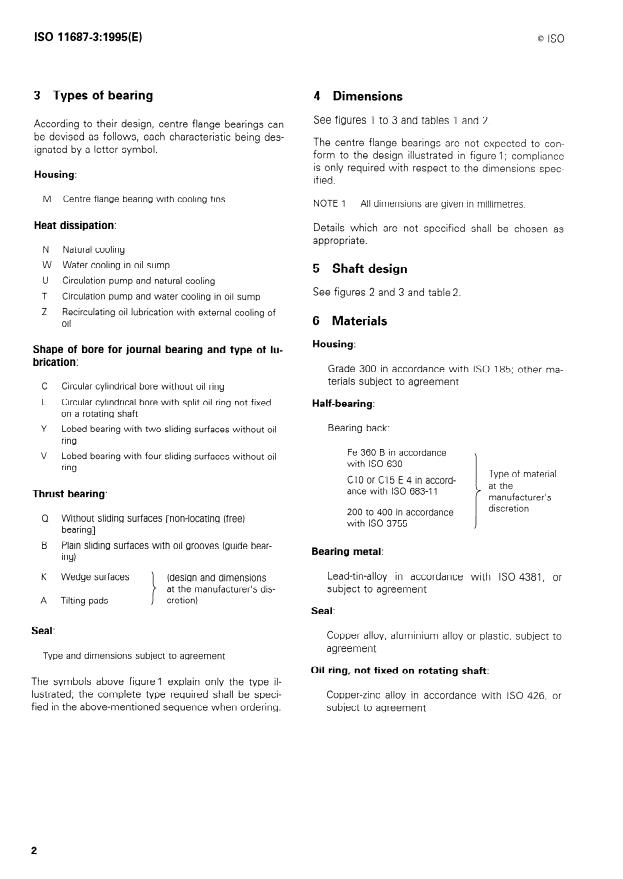 ISO 11687-3:1995 is a standard published by the International Organization for Standardization (ISO). Its full title is "Plain bearings — Pedestal plain bearings — Part 3: Centre flange bearings". This standard covers: Specifies design characteristics (classification, dimensions, materials, designation) for centre flange bearings for the size range 9 to 28, as well as design characteristics for shafts. Is applicable to centre flange bearings used mainly in electrical and turbo engineering industries.