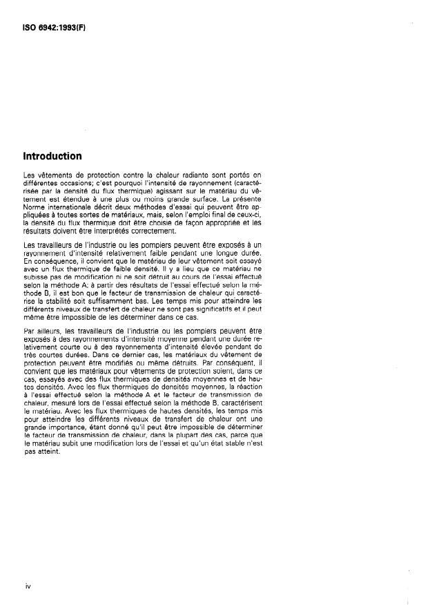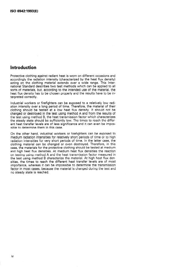 ISO 6942:1993 is a standard published by the International Organization for Standardization (ISO). Its full title is "Clothing for protection against heat and fire — Evaluation of thermal behaviour of materials and material assemblies when exposed to a source of radiant heat". This standard covers: Specifies two complementary methods carried out at room temperature: method A is used for visual assessment of any changes in the material after the action of heat radiation; with method B, the protective effect of the materials is determined. The materials may be tested either by both methods or by only one of them. The tests according to these two methods serve to classify materials; however, to be able to make a statement or prediction as to the suitability of a material for protective clothing additional criteria must be taken into account.