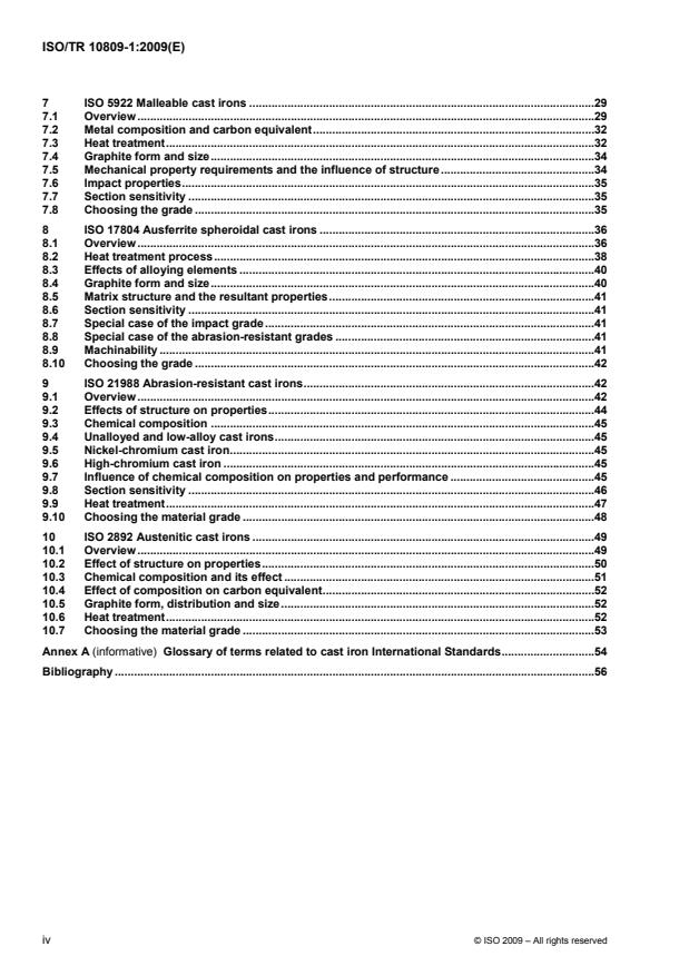 ISO/TR 10809-1:2009 is a technical report published by the International Organization for Standardization (ISO). Its full title is "Cast irons — Part 1: Materials and properties for design". This standard covers: The purpose of ISO/TR 10809-1:2009 is to assist the designer and engineer in understanding the family of cast iron materials and to utilize them with a more complete knowledge of their potential, among the wide range of other engineering materials and fabrication methods now available. A considerable amount of the data provided is metallurgical, but it is usually the metallurgical aspects of the cast irons that create misunderstandings when these materials are specified. This is because metallurgy is not one of the scientific disciplines taught to engineering students. Thus, such students often have a lack of knowledge regarding the fundamentals underpinning the material properties of cast irons. ISO/TR 10809-1:2009 suggests what can be achieved, what cannot be achieved and why, if and when cast irons are specified. It is not designed to be a textbook of metallurgy. It is intended to help people to choose the correct material for the right reasons and also to help to obviate the specification or expectation of unrealistic additional requirements, which are unlikely to be met and which can be detrimental to the intended application.