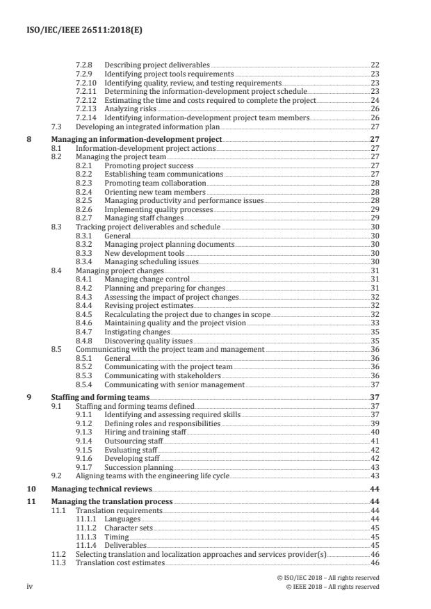 This document supports the needs of users for consistent, complete, accurate, and usable information. It provides requirements for strategy, planning, managing, staffing, translation, production, and quality and process-maturity assessment for managers of information for users. It specifies processes and procedures for managing information for users throughout the product- or systems-development life cycle. It also includes requirements for key documents produced for managing information for users, including strategic and project plans. This document provides an overview of the information-management processes that are specific for the management of information for users. It addresses the following activities: — developing a comprehensive strategy for information development; — assessing user information needs; — planning and managing an information-development project; — staffing and forming information-development teams; — reviewing and testing information for users; — managing the translation process; — publishing and delivering information for users; — evaluating customer satisfaction and information quality; — measuring productivity, efficiency, and costs; and — evaluating organizational maturity. The guidance in this document applies to multiple project management approaches, including both agile and traditional practices. Traditional practices can encompass predictive, waterfall, or other top-down management methods. Where certain practices are common in agile project management, they are noted. This document is applicable for use by managers of information for users or organizations with information developers. This document can also be consulted by those with other roles and interests in the process of developing information for users: — managers of the product and system development process; — acquirers of information for users prepared by suppliers; — experienced information developers who prepare information for users; — human-factors experts who identify principles for making information for users more accessible and easily used; and — user interface designers and ergonomics experts working together to design the presentation of information. This document can be applied to manage the following types of information for users, although it does not cover all aspects of them: — information for user assistance, training, marketing, and systems documentation for product design and development, based on reuse of user information topics; — multimedia marketing presentations using animation, video, and sound; — information developed for virtual and augmented reality presentations; — computer-based training (CBT) packages and course materials intended primarily for use in formal training programs; and — information describing the internal operation of products.
