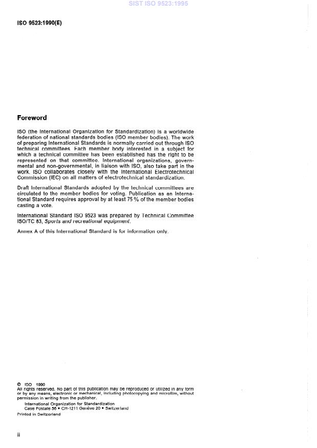 ISO 9523:1990 is a standard published by the International Organization for Standardization (ISO). Its full title is "Touring ski-boots for adults — Interface with ski-binding". This standard covers: La présente Norme internationale prescrit les dimensions et caractéristiques de la zone d'interface de la semelle et des parties de la tige des chaussures de ski de randonnée pour donner aux fixations de ski de randonnée des conditions d'attache définies. Elle est applicable aux chaussures de randonnée de pointure 15,0 et plus large dans le système Mondopoint (correspondant aux types A et C de [1]).