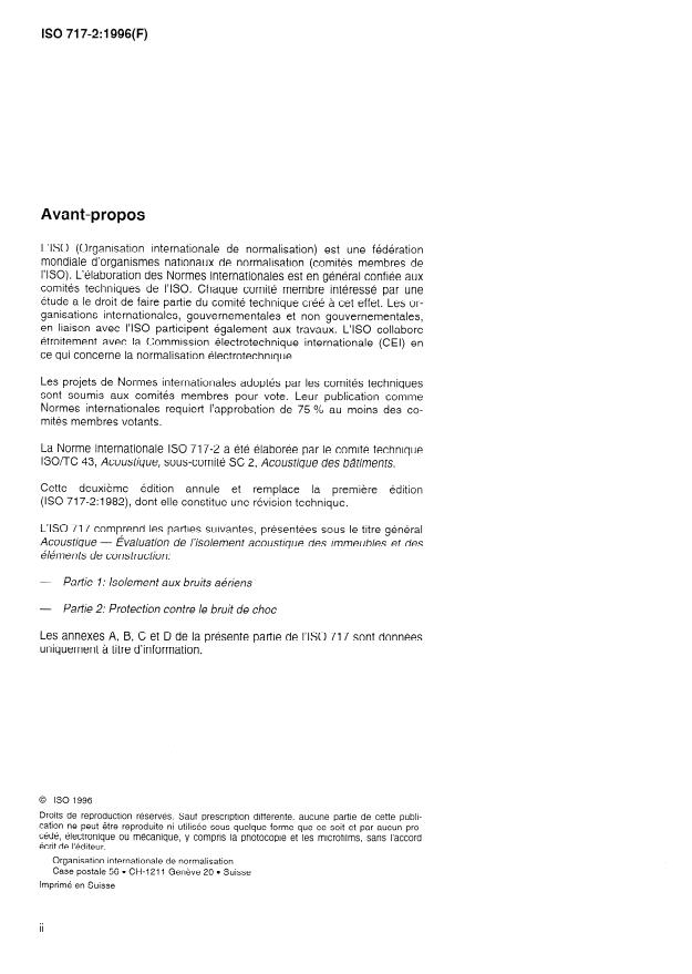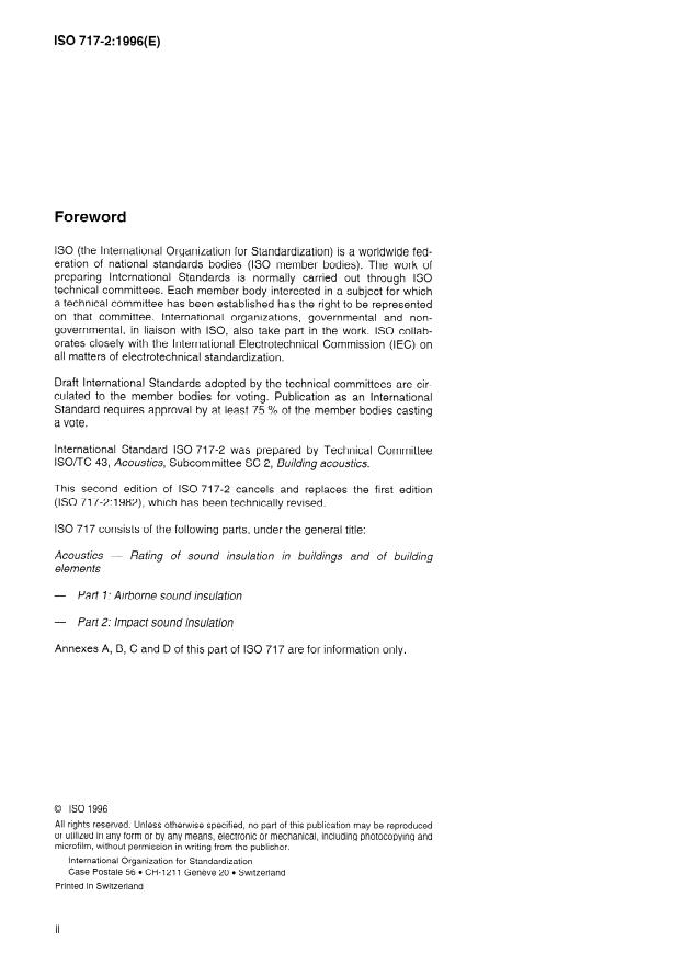 ISO 717-2:1996 is a standard published by the International Organization for Standardization (ISO). Its full title is "Acoustics — Rating of sound insulation in buildings and of building elements — Part 2: Impact sound insulation". This standard covers: Defines single-number quantities for the impact sound insulation in buildings and of floors. Gives rules for determining these quantities from the results of measurements carried out in one-third-octave bands in accordance with ISO 140-6 and ISO 140-7, and in octave bands in accordance with ISO-140-7 for field measurements only. It also contains quantities for the impact sound reduction of floor coverings.