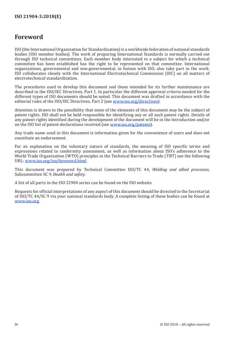 ISO 21904-3:2018 is a standard published by the International Organization for Standardization (ISO). Its full title is "Health and safety in welding and allied processes - Requirements, testing and marking of equipment for air filtration - Part 3: Determination of the capture efficiency of on-torch welding fume extraction devices". This standard covers: ISO 21904-3:2018 defines a laboratory method for measuring the welding fume capture efficiency of on-torch extraction systems. The procedure only prescribes a methodology, leaving selection of the test parameters to the user, so that the effect of different variables can be evaluated. ISO 21904-3:2018 is applicable to integrated on-torch systems and to systems where a discrete extraction system is attached to the welding torch close to the arc area. The methodology is suitable for use with all continuous wire welding processes, all material types and all welding parameters. The method can be used to evaluate the effects of variables such as extraction flow rate, extract nozzle position, shielding gas flow rate, welding geometry, welding torch angle, fume emission rate, etc., on capture efficiency.