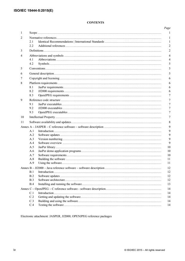 ISO/IEC 15444-5:2015 defines a set of lossless and lossy compression methods for coding continuous-tone, bi-level, greyscale or colour digital still images. This Recommendation | International Standard provides three independently created software reference implementations of Rec. ITU-T T.800 | ISO/IEC 15444-1, in order to assist implementers of Rec. ITU-T T.800 | ISO/IEC 15444-1 in testing and understanding its content. The packages are JASPER, JJ2000 and OPENJPEG. The reference software packages are informative only. This Recommendation | International Standard does not define any additional part of the JPEG 2000 image coding system. Each version of the reference software contains source code, which may be compiled to provide the following functionality: - transcoding from selected, widely available image formats into a JPEG 2000 codestream; - transcoding from selected, widely available image formats into the JP2 file format; - selection of a wide range of JPEG 2000 encoding options (as documented in each reference software); - decoding from a JPEG 2000 codestream to a range of selected widely available image formats; - Processing of a JP2 file to extract a JPEG 2000 codestream for decoding and conversion to a range of selected widely available image formats. - The ability to extract metadata from a JP2 file, including the contents of the Image Header box and the colour space. - The decoding of JP2 files that use the Three-Component Matrix-Based form of the Restricted ICC method for the specification of colour space and the conversion of the decoded image data to the sRGB colour space for display, including limited upsampling of all decoded components to the same resolution. - The decoding of JP2 files that use the Monochrome form of the Restricted ICC method for the specification of colour space and the conversion of the decoded image data to the sRGB based greyscale space as defined within the JP2 file format. - The decoding of JP2 files that use the sYCC colour space and the conversion of the decoded image data to the sRGB colour space for display, including upsampling of all decoded components to the same resolution. - some additional tools to help with evaluation and testing. The reference software is intended for use as a testing and validation tool for other implementations of JPEG 2000, and to help in the understanding of Rec. ITU-T T.800 | ISO/IEC 15444-1. Although components of the reference software may find application in software intended for product development, this was not an objective of the development of this software, and prospective implementers are cautioned against making any estimations of performance or resource usage based on the reference software.