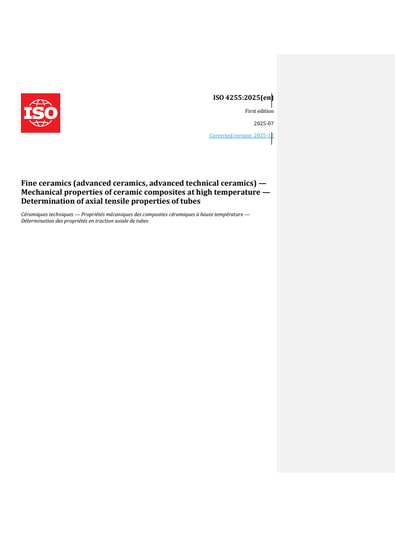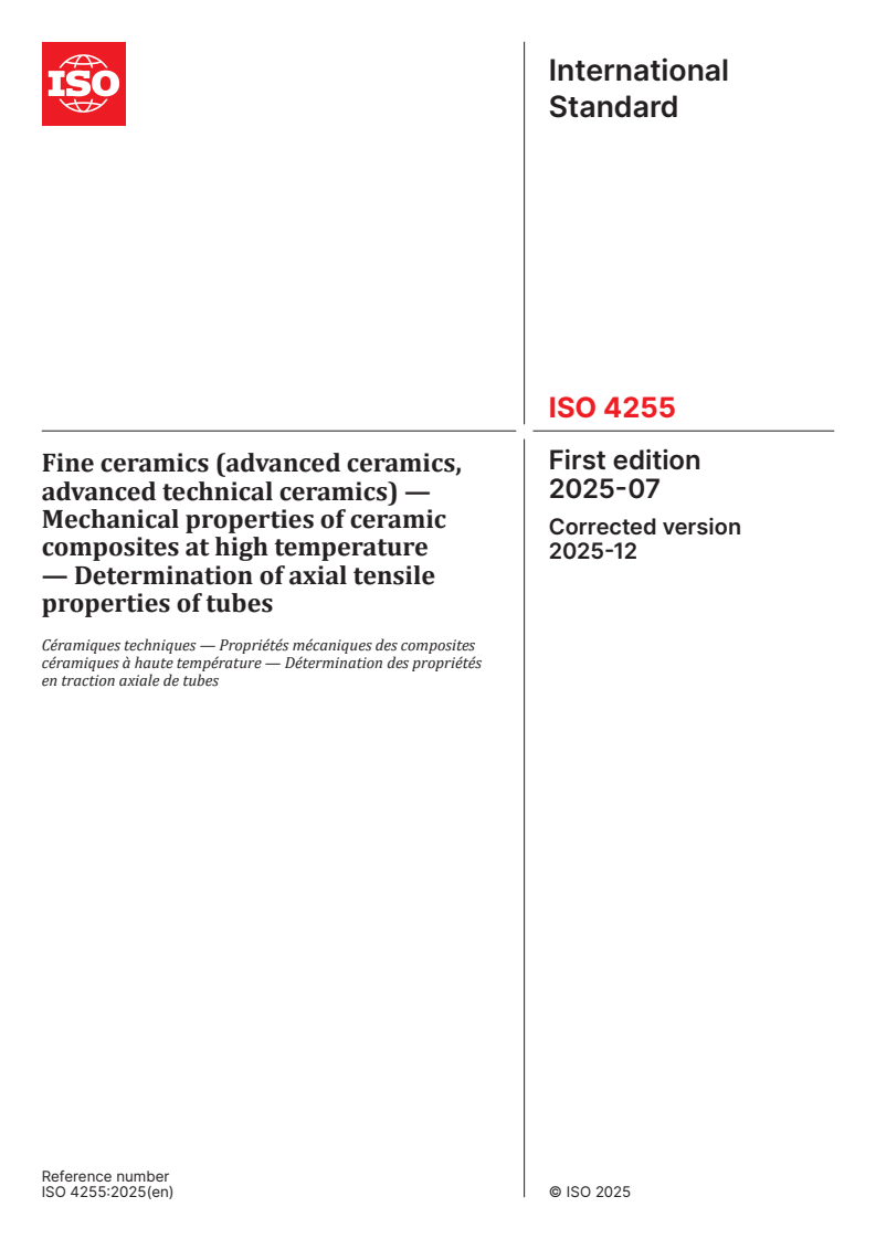 ISO 4255:2025 - Fine ceramics (advanced ceramics, advanced technical ceramics) — Mechanical properties of ceramic composites at high temperature — Determination of axial tensile properties of tubes Released:12/1/2025