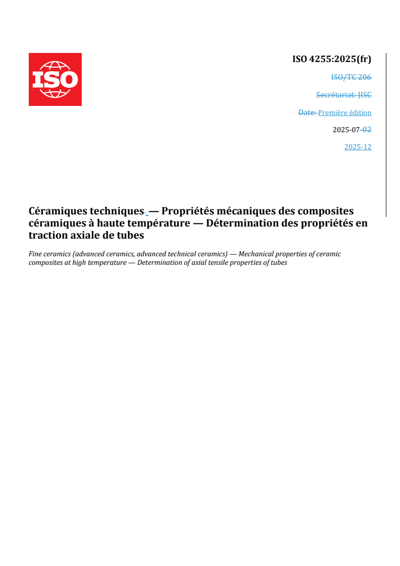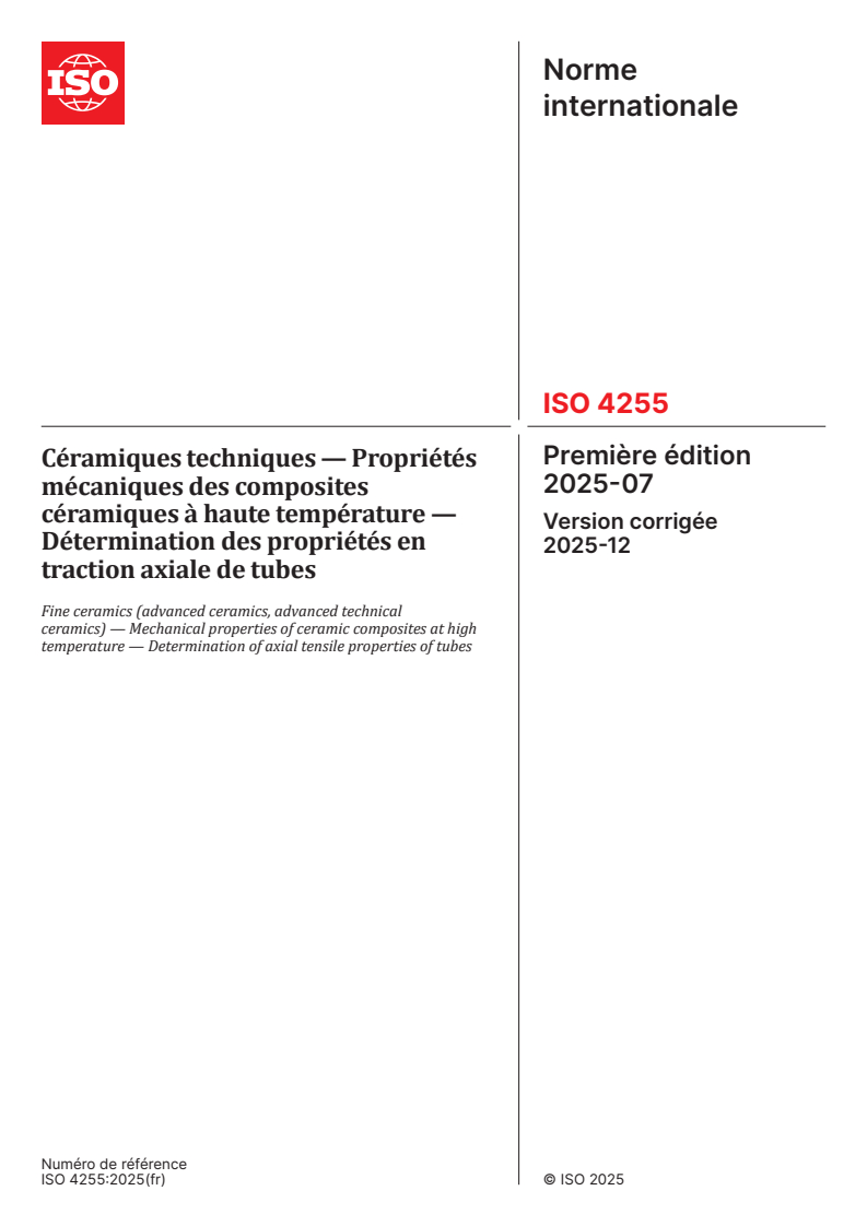 ISO 4255:2025 - Céramiques techniques — Propriétés mécaniques des composites céramiques à haute température — Détermination des propriétés en traction axiale de tubes Released:12/1/2025