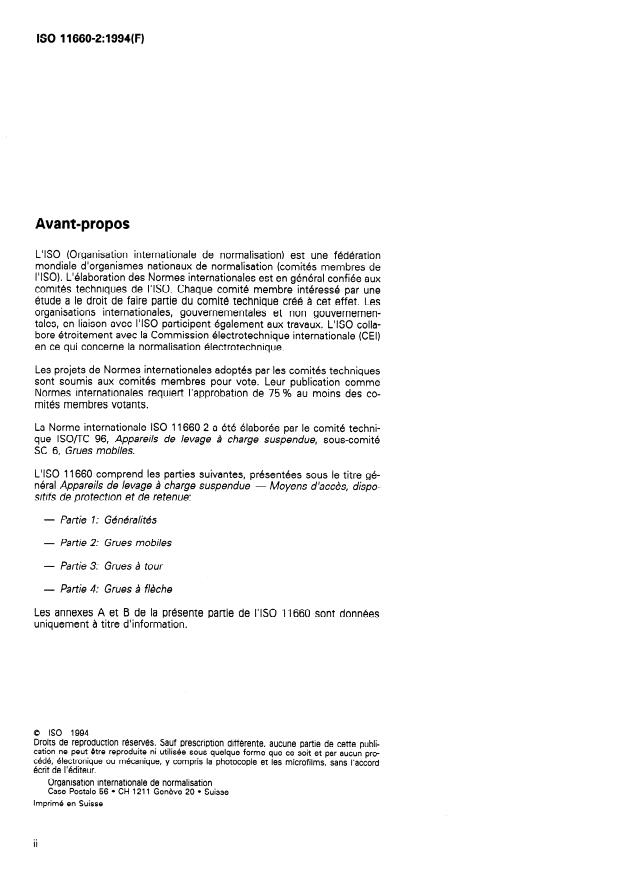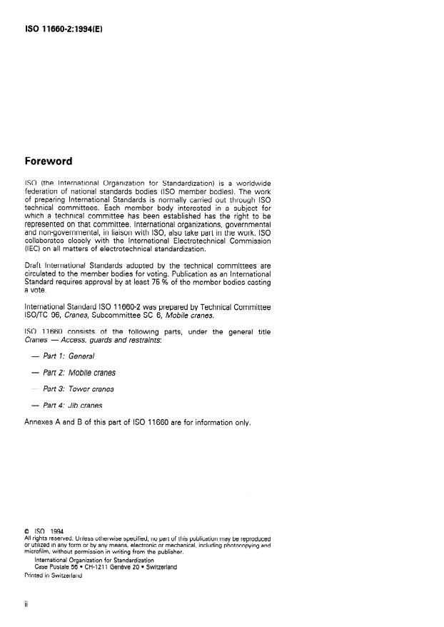 INTERNATIONAL STANDARD ISO 11660-2 First edition 1994-08-15 Cranes - Access, guards and restraints - Part 2: Mobile cranes Appareils de levage a Charge suspendue - Moyens d’acces, dispositifs < de protection et de retenue - Partie 2: Grues mobiles Reference number ISO 11660~2:1994(E) SIST ISO 11660-2:1997