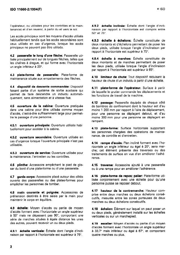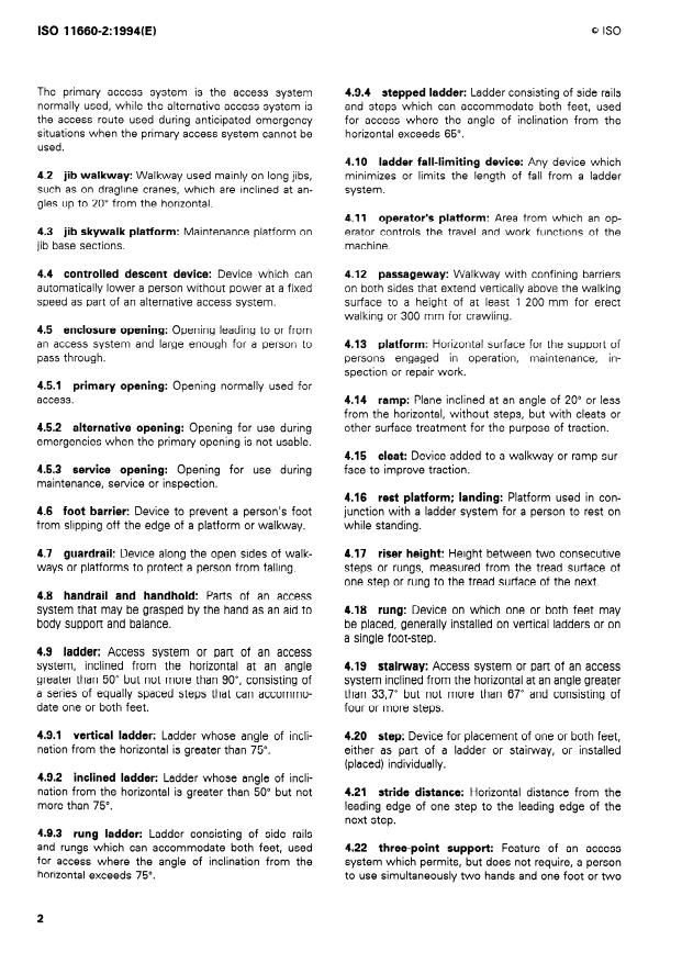 ISO 11660~2:1994(E) 0 ISO .4 stepped ladder: Ladder consisting of side rails and Steps which tan accommodate both feet, used for access where the angle of inclination from the horizontal exceeds 65”. .lO ladder fall-limiting device: Any device which minimizes or limits the length sf fall from a ladder System. 4.2 jib walkway: Walkway used mainly on long jibs, such as on dragline cranes, which arc inclined at an- gles up to 20” from the horizontal. tor’s platform: Area from which an op- erator controls the travel and work functions of the machine. 4.3 jib skywalk platform: Maintenance platform on jib base sections. 4.4 controlled descent d vice: Devise which tan automatically lower a person without ßovver at a fixed speed as part of an alternative access System. 4.12 8SSB war: V’Valkway with confining barriers on both sides that extend vertically above the walking surface to a height of at least 1 200 mm for erect walking or 300 mm for crawling. 4.5 enclosure opening: Opening leading to or from an access System and large enough for a person to pass through. 4.13 latformn Horizontal surface for the support of persons engaged in Operation, maintenance, in- spection or repair work. 4.5.1 primary access. opening: Opening normally used for 4.14 ramp: Plane inclined at an angle of 20” or less from the horizontal, without Steps, but with cleats or other surface treatment for the purpose of traction. 4.5.2 alternative opening: Opening for use during emergencies when the primary opening is not usable. 4.15 cleat: Device added to a walkway or ramp sur- face to improve traction. 4.5.3 Service opening: Opening for use during maintenance, Service or inspection. 4.16 rest platform; landing: Platform used in con- junction with a ladder System for a person to rest on while standing. 4.6 foot barrier: Device to prevent a person’s foot from slipping off the edge of a platform or walkway. 4.7 guardrail: Device along the open sides of walk- ways or platforms to protect a person from falling. 4.17 riser height: Height between two consecutive Steps or rungs, measured from the tread surface of one step or rung to the tread surface of the next. 4.8 handrail and handhold: Parts of an access System that may be grasped by the hand as an aid to body support and balance. 4.18 rung: Device on which one or both feet may be placed, generally installed on vertical ladders or on a Single foot-Step. 4.9 ladder: Access System or part of an access System, inclined from the horizontal at an angle greater than 50” but not more than 90”, consisting of a series of equally spaced Steps that tan accommo- date one or both feet. 4.19 stairway: Access System or part of an access System inclined from the horizontal at an angle greater than 33,7” but not more than 67” and consisting of four or more Steps. 4.9.1 vertical ladder: Ladder whose angle of incli- nation from the horizontal is greater than 75”. 4.20 Step: Device for placement of one or both feet, either as patt of a ladder or stairway, or installed (placed) individually. 4.9.2 inclined ladder: Ladder whose angle of incli- nation from the horizontal is greater than 50” but not more than 75”. 4.21 stride distance: Horizontal distance from the leading edge of one step to the leading edge of the next Step. 4.9.3 rung ladder: Ladder consisting of side rails and rungs which tan accommodate both feet, used for access where the angle of inclination from the horizontal exceeds 75”. 4.22 three-Point support: Feature of an access System which permits, but does not require, a person to use simultaneously two hands and one foot or two 2 SIST ISO 11660-2:1997