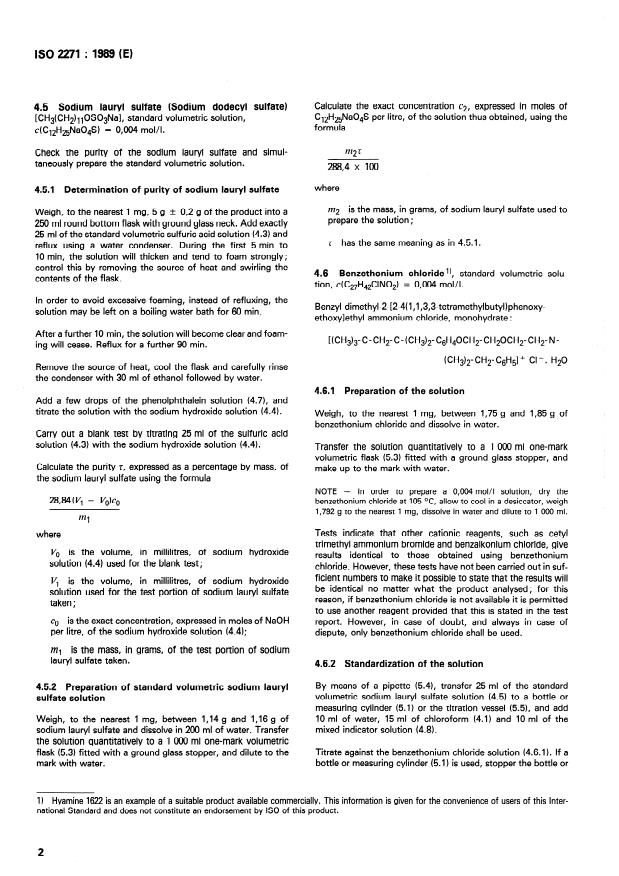 ISO 2271:1989 is a standard published by the International Organization for Standardization (ISO). Its full title is "Surface active agents — Detergents — Determination of anionic-active matter by manual or mechanical direct two-phase titration procedure". This standard covers: The substance is determined in a medium consisting of an aqueous and a chloroform phase by titration with a standard volumetric cationic-active solution (benzethonium- chloride) in the presence of an indicator which consists of a mixture of cationic dye (dimidium bromide) and an anionic dye (acid blue 1). The method is applicable to solids or to aqueous solutions of the active material. The relative molecular mass of the anionic active matter has to be known. The method is not applicable if cationic surface active agents are present.