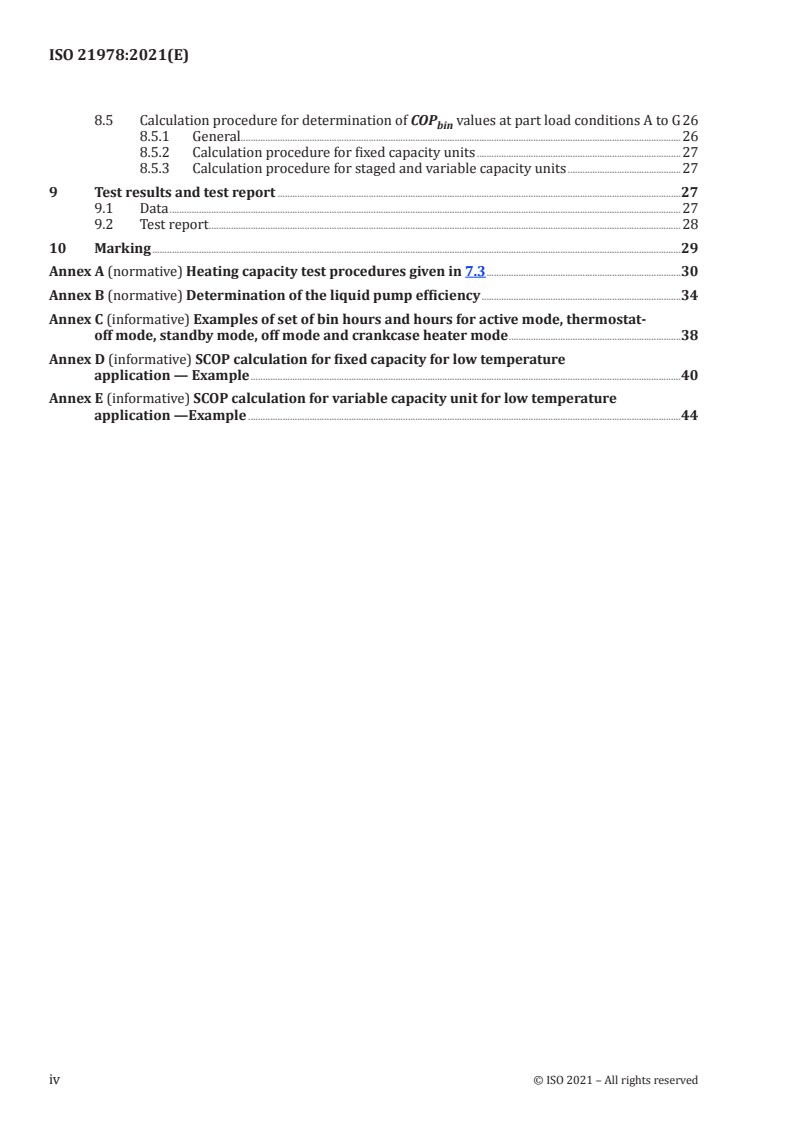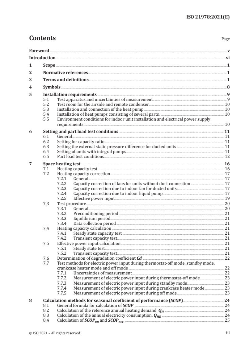 ISO 21978:2021 is a standard published by the International Organization for Standardization (ISO). Its full title is "Heat pump water heater - Testing and rating at part load conditions and calculation of seasonal coefficient of performance for space heating". This standard covers: The document specifies test conditions for determining the seasonal performance characteristics of air source heat pump water heaters for space heating with electrically driven compressors with or without supplementary heater. The purpose of this document is to rate performance of the heat pump water heaters for space heating with no operation of any supplementary heater. In the case of heat pump water heaters for space heating consisting of several parts with refrigerant or water connections, this document applies only to those designed and supplied as a complete package. The seasonal coefficient of performance depends, inter alia, on the climate conditions and temperature regime of the space heating distribution network. This document defines: - three design conditions, each of them being characterized by a design temperature which represents the lowest temperature that can occur in that design condition; - three water temperature distribution regimes, namely "temperature application" in the text. The user of this document is free to determine the seasonal coefficient of performance for one or more of the defined design conditions and for one or more of the defined temperature applications. This document also provides a full description of three heating seasons that can be used with the associated design conditions.