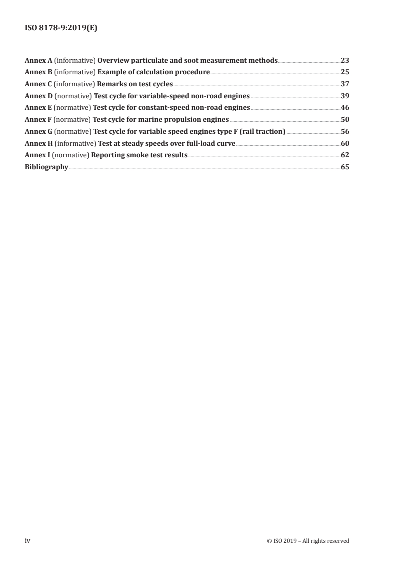 ISO 8178-9:2019 is a standard published by the International Organization for Standardization (ISO). Its full title is "Reciprocating internal combustion engines - Exhaust emission measurement - Part 9: Test cycles and test procedures for measurement of exhaust gas smoke emissions from compression ignition engines using an opacimeter". This standard covers: This document specifies the measurement procedures and test cycles for the evaluation of smoke emissions from compression ignition engines using an opacimeter. The tests are carried out under steady-state and transient operation using tests cycles which are representative of a given application. The smoke testing is conducted using opacimeter-type smoke meters which operate on the light extinction principle. The purpose of this document is to define the smoke test cycles and the methods used to measure the opacity and for the determination of the light absorption coefficient. It allows the use of either full-flow or partial-flow opacimeters and corrects for differences in rise time between the two types of opacimeters. Specifications of the apparatus for the measurement of opacity can be found in ISO 11614. The test procedures and measurement techniques described in this document are applicable to reciprocating internal combustion (RIC) engines in general. Annex D, Annex E, Annex F and Annex G each contains a test cycle that is relevant only for those specific applications listed in the first subclause of that annex. Where possible, the smoke test cycle described in the annex utilizes the engine and machine categories developed in ISO 8178‑4. For certain categories of non-road engines "at site" rather than "test bed" smoke test procedures can prove to be necessary. For engines used in machinery covered by additional requirements (e.g. occupational health and safety regulations), additional test conditions and special evaluation methods can apply.