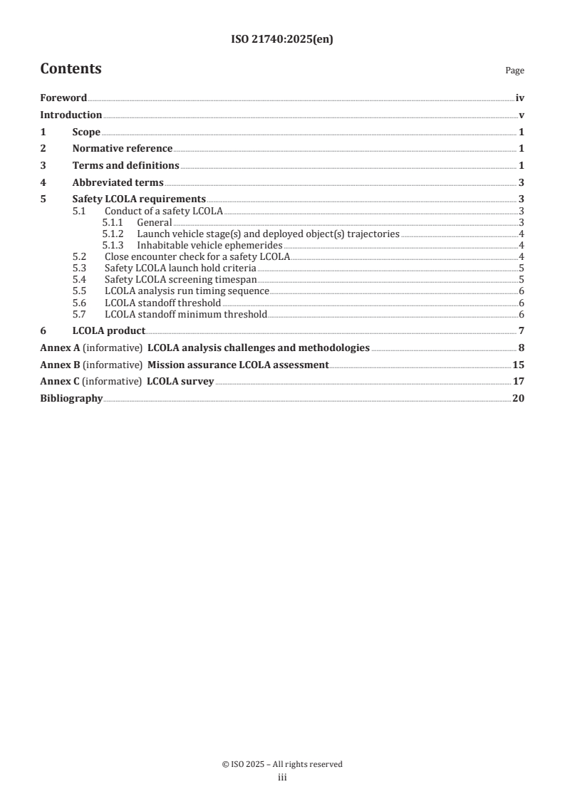 ISO 21740:2025 is a standard published by the International Organization for Standardization (ISO). Its full title is "Space systems - Launch window estimation and collision avoidance". This standard covers: This document establishes the general safety launch collision avoidance (safety LCOLA) requirements for the avoidance of collision between the collection of newly launched objects resulting from a space launch [including launch vehicle stage(s) and payloads or released objects] and human-inhabited or human-habitable space stations and space vehicles. The document specifies the requirements for the analysis of launch times and procedures for identifying safe launch opportunities. It also describes the assessment and constraints for collision avoidance risk evaluation metrics (launch collision probability and standoff distance).