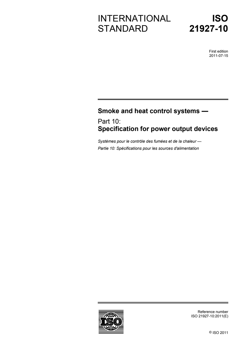 ISO 21927-10:2011 specifies requirements and gives test methods for primary and secondary electrical and pneumatic power output devices, designed for use in smoke and heat control systems in buildings. A summary of functions is given.